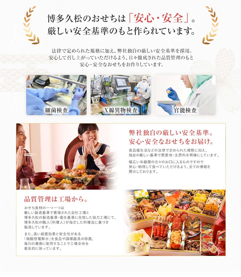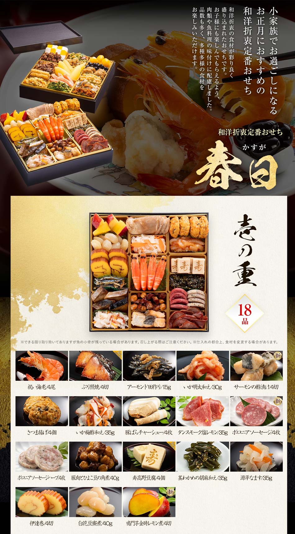 ○原材料名:1の重[伊達巻(国内製造)、味付高野豆腐、野菜入さつま揚げ、ブリ照焼、豚バラチャーシュー、サーモン酢漬、ひよこ豆と豚肉角煮、白花豆甘煮、有頭えび、さつまいもレモン煮、いか梅酢和え(いか、大根、砂糖混合ぶどう糖果糖液糖、醸造酢、人参、生姜、梅酢、その他)、塩レモンたれ豚タン、茎ワカメごま和え、なます(大根、人参、ピクルスビネガー、食塩)、いか魚卵和え(いか、数の子、食塩、砂糖混合ぶどう糖果糖液糖、発酵調味料、辛子明太子、その他)、ポークソーセージ、ボロニアソーセージ、アーモンド入田作り]