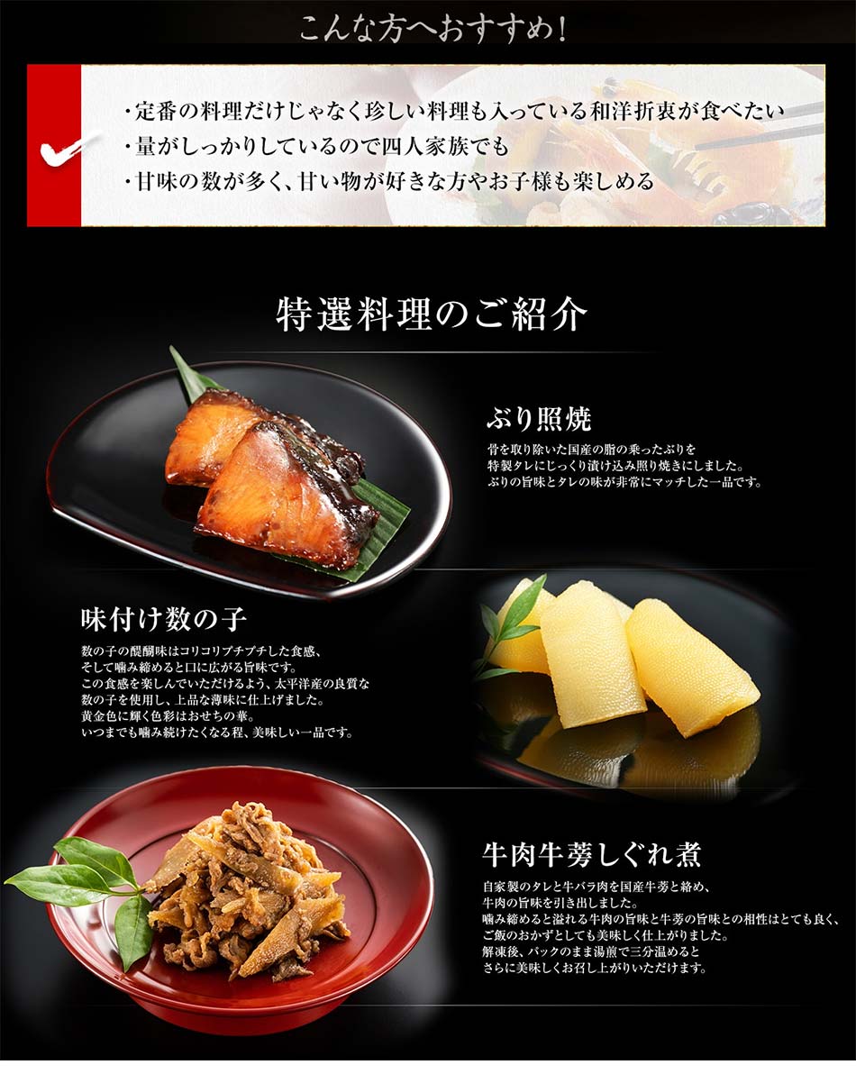 和洋折衷の食材が彩り良く盛り込まれたおせちです。お子様にも楽しんでもらえるよう、肉類や魚料理の味付けに配慮しました。品数も多く、多種多様の食材をお楽しみいただけます。