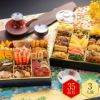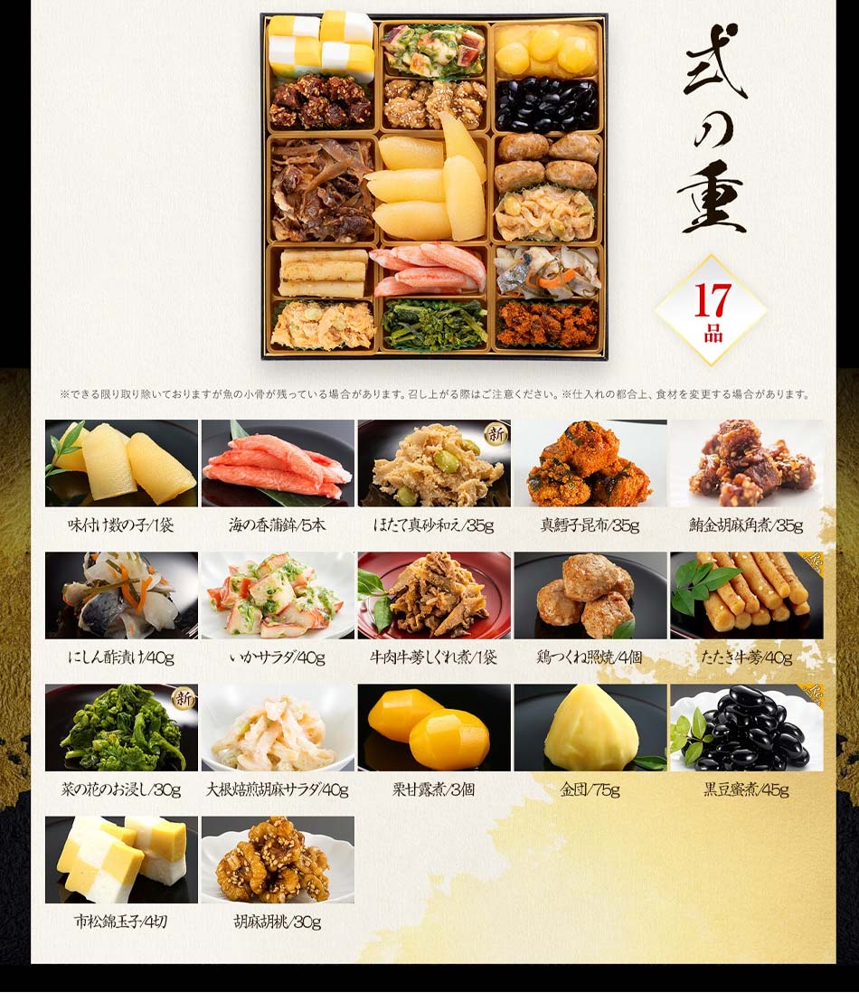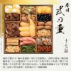 2の重[サツマイモあん、牛ごぼうしぐれ煮、照焼鶏つくね、錦玉子(卵白、魚肉、砂糖、植物油、その他)、黒豆甘煮、味付数の子、かに風味蒲鉾、ニシン酢漬(大根、ニシン、砂糖混合ぶどう糖果糖液糖、醸造酢、人参、その他)、いかサラダ(いか、砂糖混合ぶどう糖果糖液糖、半固体状ドレッシング、その他)、味付ごぼう、ごまドレサラダ(大根、半固体状ドレッシング、枝豆、数の子、その他)、帆立真砂和え(ボイル帆立、むき枝豆、明太子、耐熱マヨネーズ、薄口醤油)、味付真鱈卵昆布、マグロ佃煮、菜の花のお浸し、くるみ佃煮、栗甘露煮]