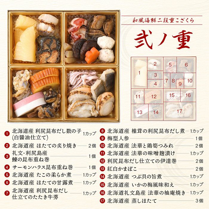 他の画像を見る 北海道の高級和風海鮮おせち「こざくら」 二段重 一年の感謝と新年の福を願う食卓に心ばかりの北国の春を添えて おせち 2026 北海道の和風海鮮おせち「こざくら」 二段重 全30品目 約2人前 送料込 ※12月30日お届け 予約商品 こちらは予約商品です 予約販売価格 ¥ 14,480 税込 予約受付期間 2025/10/07 10:00 〜 2025/11/30 23:59 お手軽にオードブル感覚で北海道の海鮮を楽しめるおせちです。 年賀のご挨拶の手土産など贈り物にお遣いいただくのにもぴったりです。 詳細を見る お気に入りに登録する