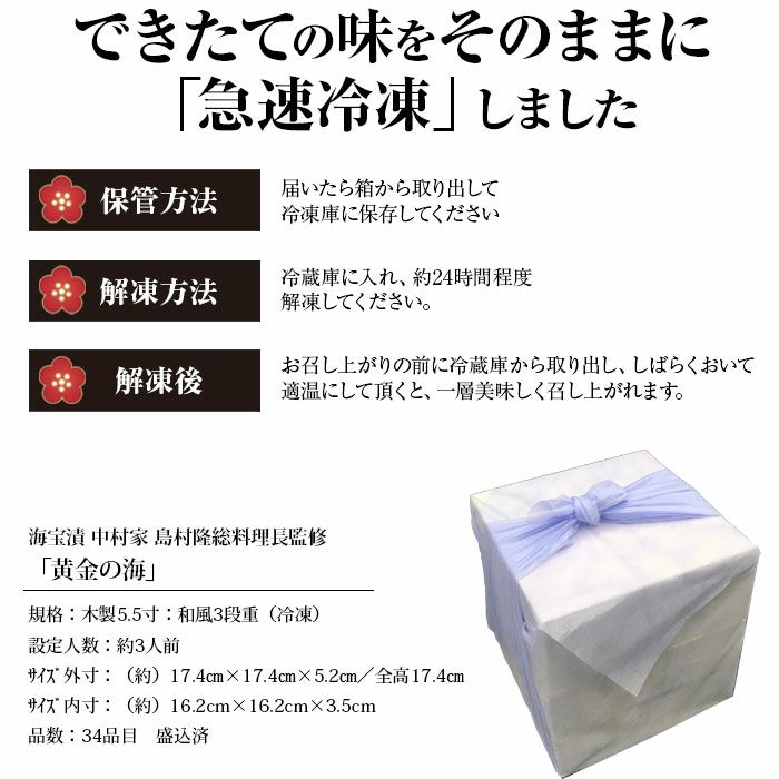 他の画像を見る 三陸海宝漬 中村家「黄金の海」 海宝漬 中村家の贅を尽くしたおせち おせち 2026 海宝漬 中村家「黄金の海」全34品(約3人前)送料込 ※12月30日お届け 販売価格 ¥ 19,980 税込 販売を終了しました。 在庫切れ <ブランド紹介> リアス式海岸で世界でも屈指の好漁場の一つとされる三陸沖を中心に厳選した原料を使い、一品一品心を込めてお料理を作る「海宝漬 中村家」。素材を吟味し、独自の技法で仕上げる「三陸海宝漬」は、長年多くのお客様に愛され続けている中村家を代表する逸品です。 <商品特徴> 常に三陸の豊富な魚介類を目にし、素材の良さをしっかりと見極めているこだわりの料理人:海宝漬 中村家・島村隆総料理長の監修・指導による海鮮おせち。おせち料理としての縁起料理をしっかりと盛り込みつつエビ、カニ、アワビにおせち専用の「海宝漬」(うに・帆立)など選りすぐりの海の幸をふんだんに盛り込みました。 素材の良さを引き出し、手を掛けて丹精込めた料理の数々、急速冷凍技術により格別の美味しさを実現致しました。 詳細を見る お気に入りに登録する