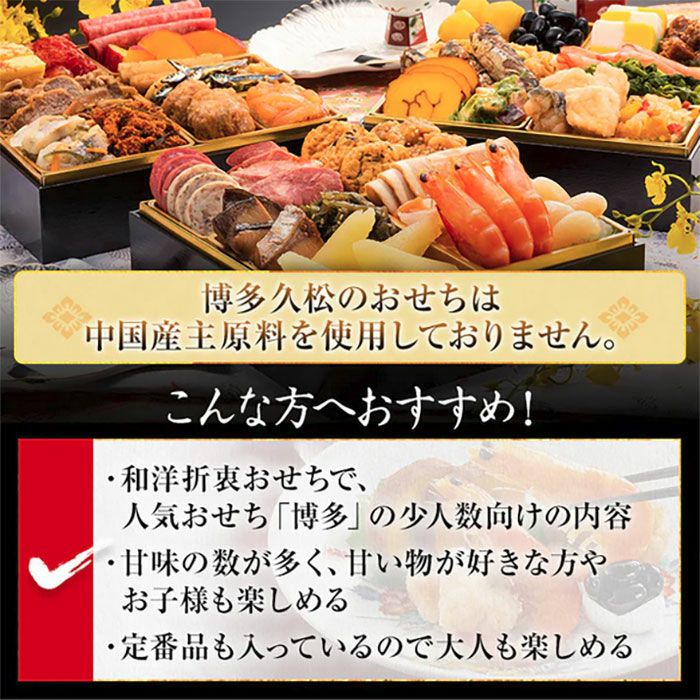 他の画像を見る 和洋折衷 本格定番三段重おせち【舞鶴】(約2~3人前) 伝統的なおせちにこだわった少人数向けの定番和洋おせち おせち 2026 和洋折衷 本格定番三段重おせち【舞鶴】(約2~3人前) 送料無料 ※12月30日お届け 予約商品 こちらは予約商品です 予約販売価格 ¥ 12,800 税込 予約受付期間 2025/10/07 10:00 〜 2025/11/30 23:59 おせちは伝統派が良いと言う少人数のご家族様に自信を持っておすすめします。おせち専門店の博多久松が作るからこそ、三段重に詰め込んだ数々の和洋折衷の食材は全てが美味。 詳細を見る お気に入りに登録する
