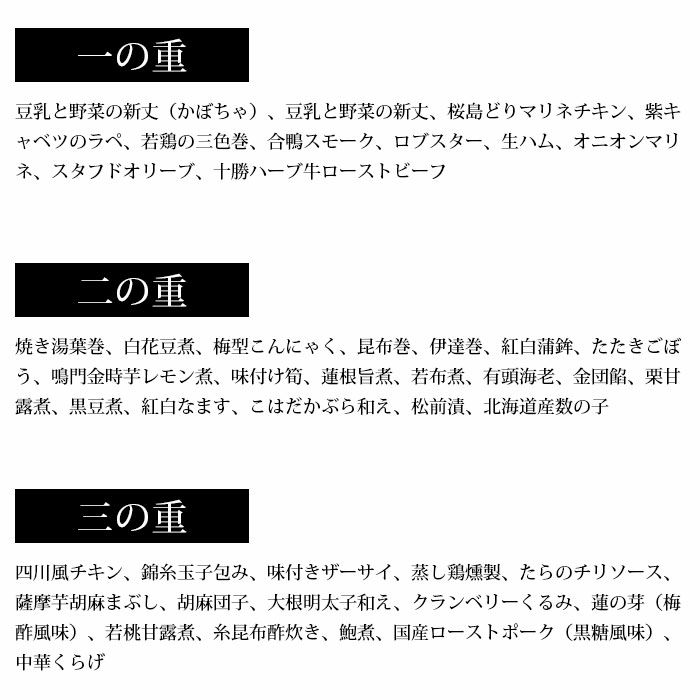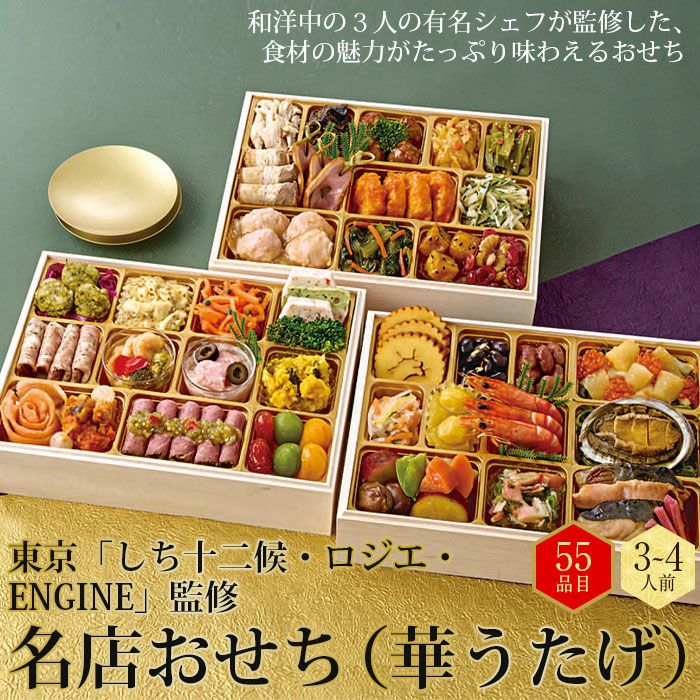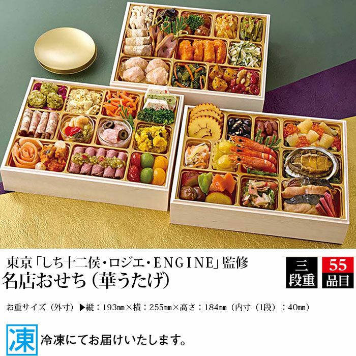他の画像を見る 東京「しち十二候・ロジエ・ENGINE」監修 名店おせち(華うたげ) 和洋中の3人の有名シェフが監修した、魅力ある食材のおせち おせち 2026 東京「しち十二候・ロジエ・ENGINE」監修 名店おせち(華うたげ) 送料無料 ※12月30日お届け 予約商品 こちらは予約商品です 予約販売価格 ¥ 23,350 税込 予約受付期間 2025/10/07 10:00 〜 2025/11/30 23:59 壱之重(和)には、東京ステーションホテル内 日本料理店【しち十二候】齋藤料理長監修で、弐之重(洋)には、渋谷区恵比寿の隠れ家的一軒家レストラン【ロジエ】金子シェフが担当し、参之重(中華)は、ヌーベルシノア(新中華)で女性客に人気の神楽坂【ENGINE】松下シェフ監修、それぞれ特徴ある食材で魅力たっぷり・・・味わいが楽しめる3名店「コラボおせち」です。 詳細を見る お気に入りに登録する