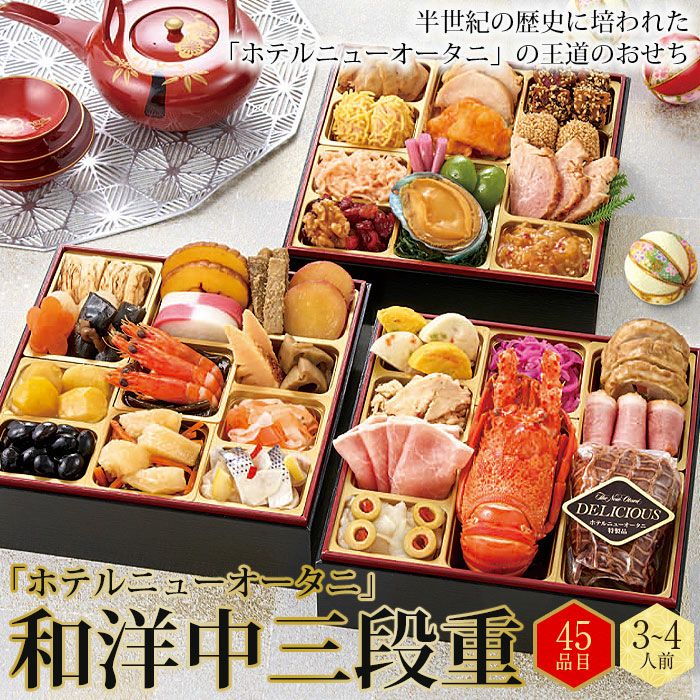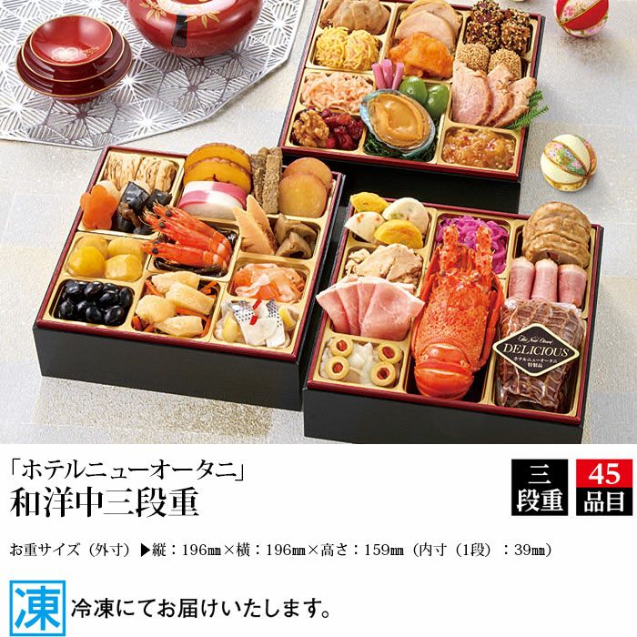 他の画像を見る 「ホテルニューオータニ」和洋中三段重 半世紀の歴史に培われた「ホテルニューオータニ」の王道おせち おせち 2026 「ホテルニューオータニ」和洋中三段重 送料無料 ※12月30日お届け 予約商品 こちらは予約商品です 予約販売価格 ¥ 27,400 税込 予約受付期間 2025/10/07 10:00 〜 2025/11/30 23:59 和の重は伝統的なおせち食材と、こはだかぶら和えや柔らかく炊き上げた国産白花豆煮。洋の重は十勝ハーブ牛ローストビーフやロブスター。中華の重は国産豚を黒糖で仕上げたローストポークと、鮑煮が入った豪華なお重となっております。 詳細を見る お気に入りに登録する