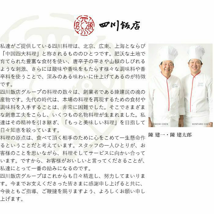 他の画像を見る 陳建一監修 赤坂四川飯店 中華オードブル(豪華13品 2倍増量版) 中華の鉄人 陳建一氏監修の中華オードブル おせち 2026 陳建一監修 赤坂四川飯店 中華オードブル(豪華13品 2倍増量版) 予約商品 こちらは予約商品です 予約販売価格 ¥ 21,400 税込 予約受付期間 2025/10/07 10:00 〜 2025/11/30 23:59 中華の鉄人・陳建一氏監修の人気メニューがセットになりました。本場四川省の3年熟成された豆板醤を使った四川麻婆豆腐、ピリ辛ながらもまろやかでコクのあるおいしさのエビチリソースの2大名物に、レストランと同様の製法で旨味たっぷりの麻婆茄子、風味豊かでちょっとピリ辛の本格的な棒々鶏などが脇を固め、杏仁豆腐まで付く豪華セット。名店の底力を感じる味わいに箸が止まらない!本中華セットはカジュアルにおせちを楽しみたいという方にもオススメです! 詳細を見る お気に入りに登録する