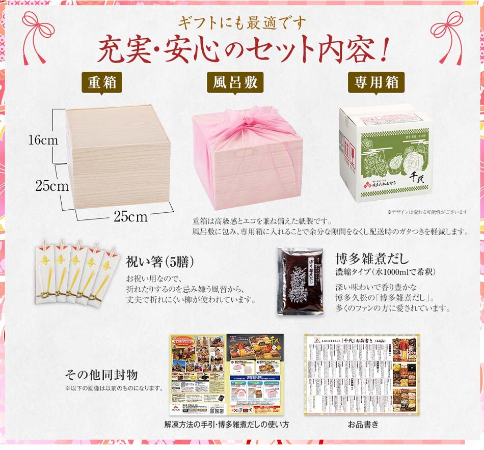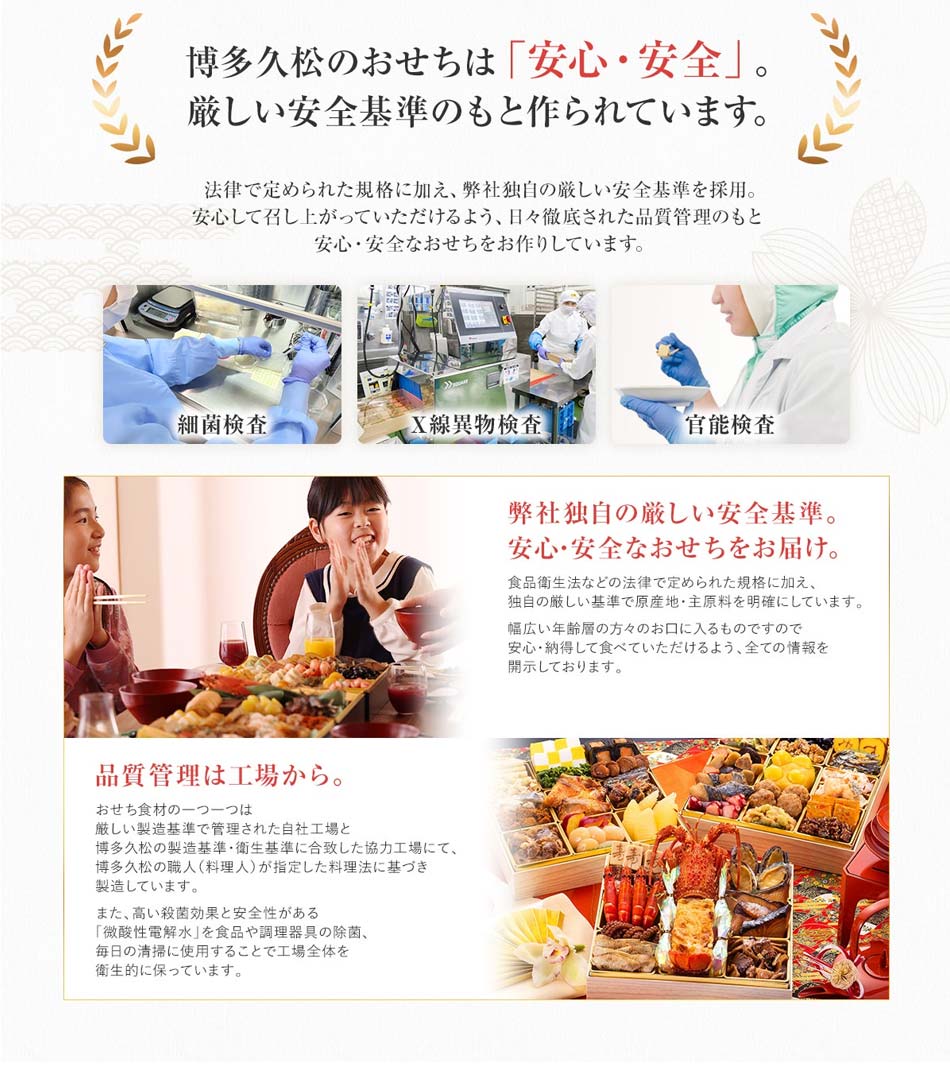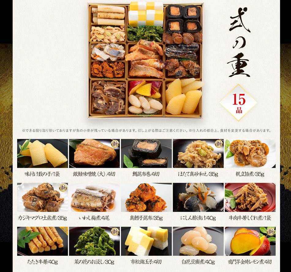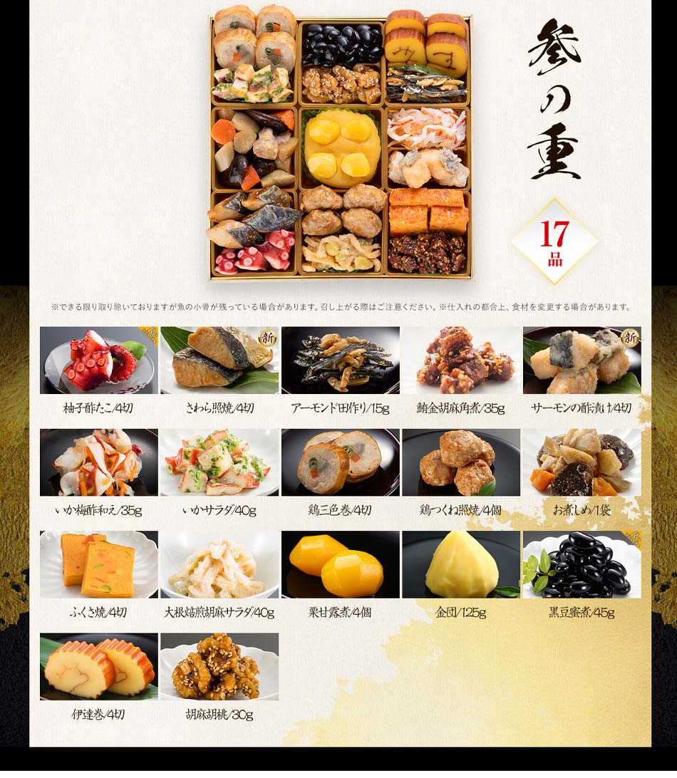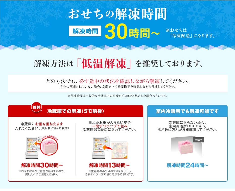 ○名称:おせち ○内容量:【一の重】伊勢海老黄金焼 / 鮑旨煮 / 炙りのどくろ酢〆 / 海老旨煮 / うまかぶり照焼 / たこ旨煮 / 黒毛和牛ステーキ / 豚角煮 / 寿高野豆腐 / ミニオーロラカスタード 【二の重】味付け数の子 / 銀鮭味噌焼(大) / 鱒昆布巻 / ほたて真砂和え / 帆立旨煮 / カジキマグロ土佐煮 / いわし梅煮 / 真鱈子昆布 / にしん酢漬け / 牛肉牛蒡しぐれ煮 / たたき牛蒡 / 菜の花のお浸し / 市松錦玉子 / 白花豆蜜煮 / 鳴門芋金時レモン煮 【三の重】柚子酢たこ / さわら照焼 / アーモンド田作り / 鮪金胡麻角煮 / サーモンの酢漬け / いか梅酢和え / いかサラダ / 鶏三色巻 / 鶏つくね照焼 / お煮しめ / ふくさ焼 / 大根焙煎胡麻サラダ / 栗甘露煮 / 金団 / 黒豆蜜煮 / 伊達巻 / 胡麻胡桃 ○原材料名:1の重[伊勢海老黄金焼(クリームソース、伊勢海老、アメリカンソース、モルネソース)(国内製造)、ブリ照焼、味付高野豆腐、たこ旨煮、えび旨煮、きのこ添え黒毛和牛ステーキ、和菓子(フラワーペースト、砂糖、寒天)、あわび旨煮、豚角煮、酢じめ炙りのどぐろ] 2の重[銀さけ味噌焼、牛ごぼうしぐれ煮、トラウトサーモン昆布巻、錦玉子(卵白、魚肉、砂糖、植物油、その他)、イワシ梅煮、味付数の子、ニシン酢漬(大根、ニシン、砂糖混合ぶどう糖果糖液糖、醸造酢、人参、その他)、味付ごぼう、白花豆甘煮、さつまいもレモン煮、帆立真砂和え(ボイル帆立、むき枝豆、明太子、耐熱マヨネーズ、薄口醤油)、帆立旨煮、カジキマグロ煮付、味付真鱈卵昆布、菜の花のお浸し] 3の重[サツマイモあん、煮物(鶏肉、人参、ごぼう、椎茸、醤油、その他)、伊達巻、袱紗焼(魚肉、人参、大豆油、枝豆、液全卵、その他)、照焼鶏つくね、野菜鶏肉巻(鶏もも肉、鶏皮、野菜(インゲン、人参、ごぼう)、醤油、その他)、さわら照焼、黒豆甘煮、サーモン酢漬、いかサラダ(いか、砂糖混合ぶどう糖果糖液糖、半固体状ドレッシング、その他)、ごまドレサラダ(大根、半固体状ドレッシング、枝豆、数の子、その他)、柚子酢ダコ、マグロ佃煮、いか梅酢和え(いか、大根、砂糖混合ぶどう糖果糖液糖、醸造酢、人参、生姜、梅酢、その他)、くるみ佃煮、栗甘露煮、アーモンド入田作り] ソルビット、加工でん粉、調味料(アミノ酸等)、トレハロース、pH調整剤、酒精、糊料(加工でん粉、増粘多糖類)、甘味料(ソルビット、ステビア、カンゾウ、スクラロース、アセスルファムK)、酸化防止剤(V.C、エリソルビン酸Na、亜硫酸塩、EDTA-Ca・Na)、グリシン、着色料(カラメル、カロテノイド、クチナシ、野菜色素、V.B2)、酸味料、環状オリゴ糖、凝固剤、重曹、酢酸Na、炭酸Ca、香料、ミョウバン、乳化剤、リン酸塩(Na、K)、漂白剤(亜硫酸塩)、唐辛子抽出物、貝Ca、ナイアシン、酵素、V.B1、香辛料抽出物、発色剤(亜硝酸Na) (一部にえび・くるみ・小麦・卵・乳成分・アーモンド・あわび・いか・オレンジ・牛肉・ごま・さけ・さば・大豆・鶏肉・豚肉・りんご・ゼラチンを含む) ○配送形態:冷凍 (宅配BOX・置配不可) ○保存方法:冷凍 ○賞味期限:2026年1月14日 ○熨斗:不可 ○名入れ:不可 ○包装:不可 ○手提げ:不可 ○荷姿:ダンボール ○備考:解凍時間は冷蔵庫で30時間程解凍してお召し上がりください。8寸三段、外寸:25.0×25.0×16.0(cm) ○製造者:【有限会社 久松】 〒811-2304福岡県糟屋郡粕屋町大字仲原2839-7