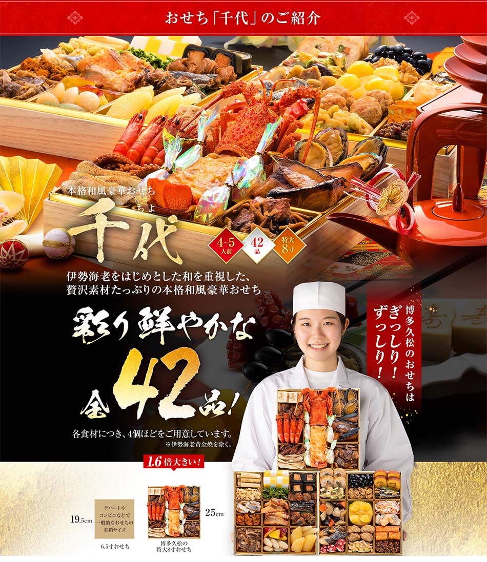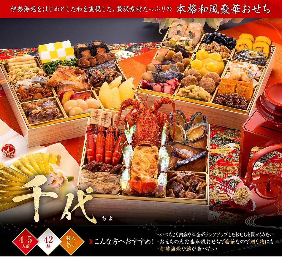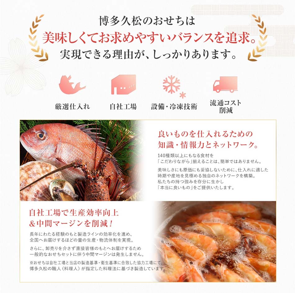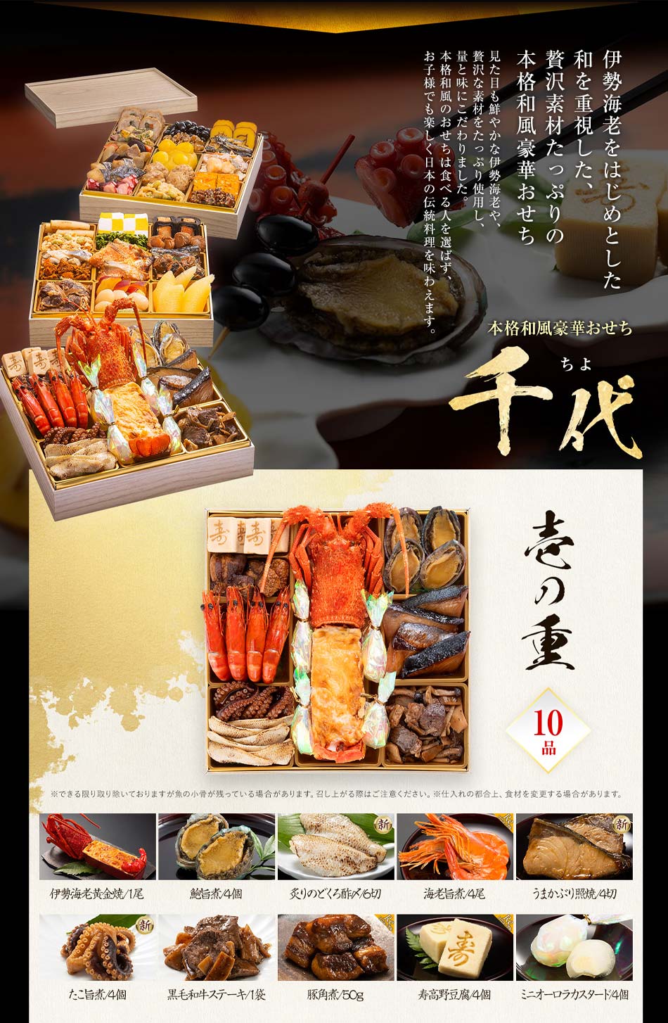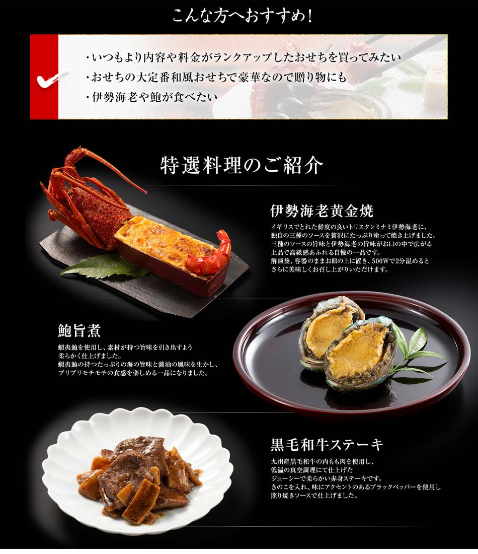 見た目も鮮やかな伊勢海老や、贅沢な素材をたっぷり使用し、量と味にこだわりました。本格和風のおせちは食べる人を選ばず、お子様でも楽しく日本の伝統料理を味わえます。