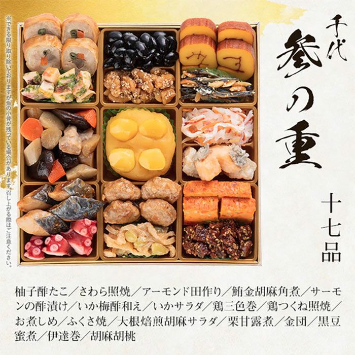 他の画像を見る 本格和風豪華おせち【 千代 】三段重(約4~5人前) 伊勢海老をはじめとした和を重視した、贅沢素材おせち おせち 2026 本格和風豪華おせち【 千代 】三段重(約4~5人前) 送料無料 ※12月30日お届け 予約商品 こちらは予約商品です 予約販売価格 ¥ 24,700 税込 予約受付期間 2025/10/07 10:00 〜 2025/11/30 23:59 見た目も鮮やかな伊勢海老や、贅沢な素材をたっぷり使用し、量と味にこだわりました。本格和風のおせちは食べる人を選ばず、お子様でも楽しく日本の伝統料理を味わえます。 詳細を見る お気に入りに登録する