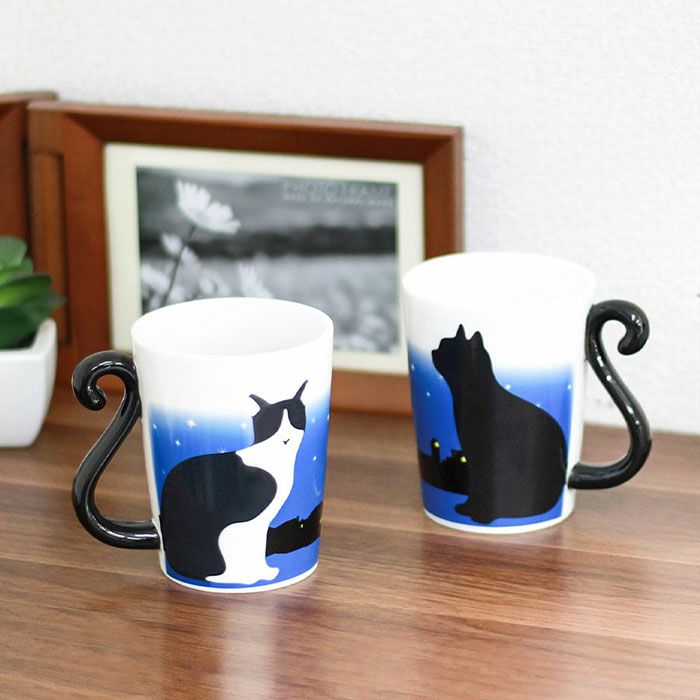 しっぽが取っ手になったツインマグカップ。お湯を入れるとネコの色が変わって黒猫から白黒猫へ!不思議なギミックが揃ってカップを使う楽しみになります。