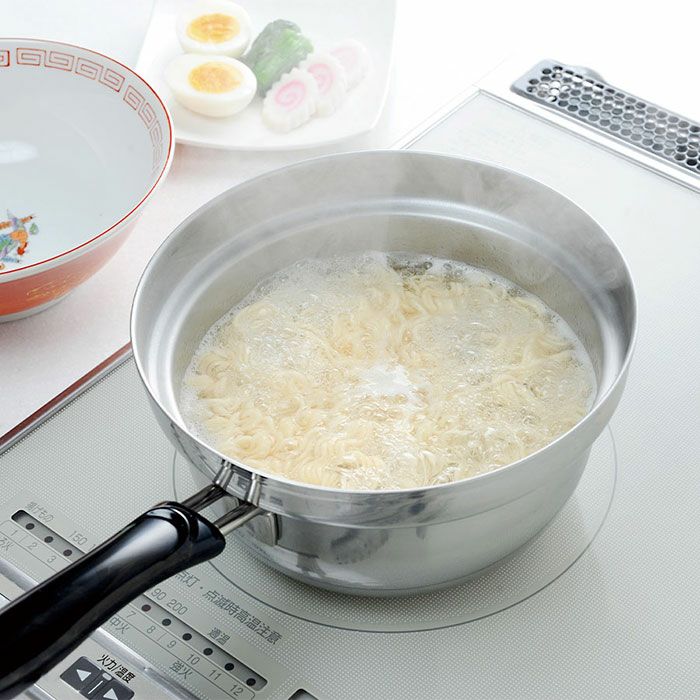 2つの効果でふきこぼれを防止!底面の丸みが大きいので、スムーズな対流で泡の発生を抑えます。また、フチが一段高くなっているため、沸騰する時に発生した泡がフチにあたり蒸発し、ふきこぼれをガードする効果を実現!茹でる時にも煮る時にもおすすめです。