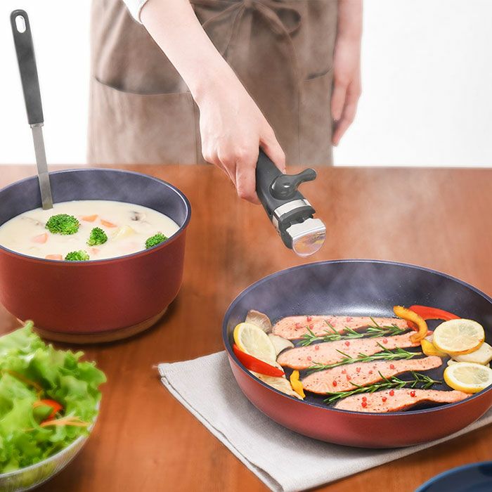 他の画像を見る ベルフィーナ 取っ手が外せる鍋セット 取っ手が外せる鍋でオーブン調理も食卓も簡単! ベルフィーナ 取っ手が外せる鍋セット 販売価格 ¥ 11,880 税込 カレーやシチューに便利なIH対応の鍋・フライパンセット。取っ手が外せるから食卓にもそのまま出せる、オーブン調理、収納もコンパクトです。内側はベルフィーナ独自のコーティングなので、少ない油で調理できて快適&ヘルシー。アルミダイキャスト製なので軽さと美味しさを両立しています。優れた熱伝導でムラなく焼け、肉厚な底面が熱をしっかり蓄えるので肉のうまみを閉じ込め、野菜炒めはシャキッと仕上がります。 詳細を見る お気に入りに登録する