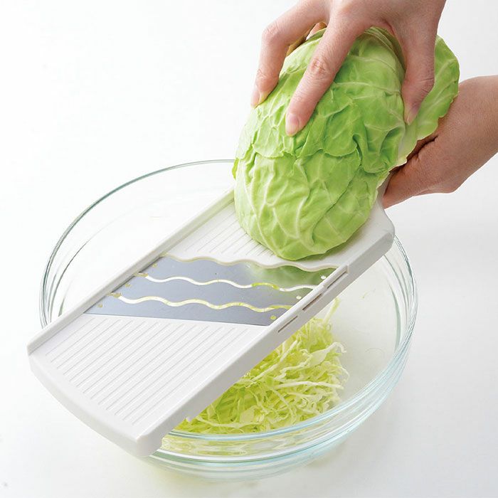 家庭用スライサーでは業界で初めて3枚刃を採用!文字通り3倍の速さで調理できるスピードスライサーです。調理の手間を大幅に短縮することができ、特に手間のかかるキャベツの千切りに威力を発揮する時短調理器具です。切れ味を追求した波形の切れ味で抵抗が少なくスムーズなスライスを実現。一度に3カットすると食材にかかる抵抗も大きくなりますが、この波刃なら、その抵抗を感じさせず、まるで1カットする時と変わりないような軽い力でスピーディにスライスすることができます。手指をガードする安全ホルダー付き。透明で食材が見えやすく、鋭利な△形のリブで、食材をしっかりとグリップします。また、ボディにセットすることができて、刃の安全カバーとしても機能を果たします。