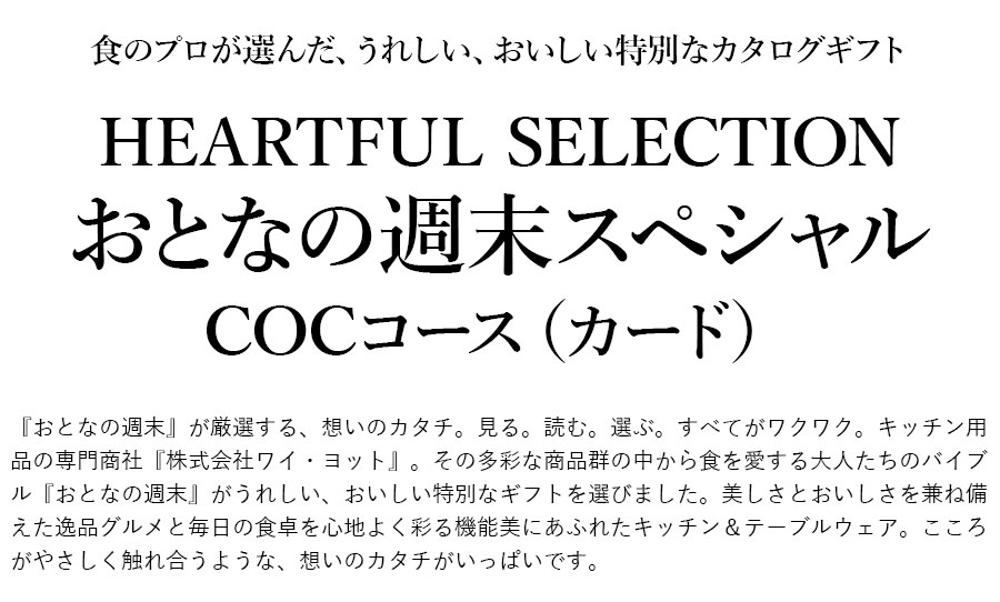 『おとなの週末』が厳選する、想いのカタチ。 見る。読む。選ぶ。すべてがワクワク。 キッチン用品の専門商社『株式会社ワイ・ヨット』。その多彩な商品群の中から食を愛する大人たちのバイブル『おとなの週末』がうれしい、おいしい特別なギフトを選びました。美しさとおいしさを兼ね備えた逸品グルメと毎日の食卓を心地よく彩る機能美にあふれたキッチン&テーブルウェア。こころがやさしく触れ合うような、想いのカタチがいっぱいです。