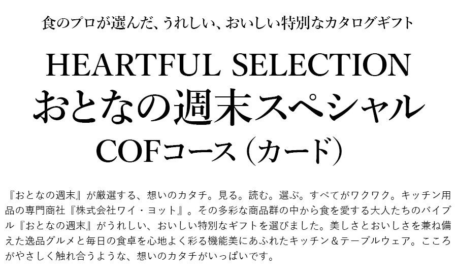 『おとなの週末』が厳選する、想いのカタチ。 見る。読む。選ぶ。すべてがワクワク。 キッチン用品の専門商社『株式会社ワイ・ヨット』。その多彩な商品群の中から食を愛する大人たちのバイブル『おとなの週末』がうれしい、おいしい特別なギフトを選びました。美しさとおいしさを兼ね備えた逸品グルメと毎日の食卓を心地よく彩る機能美にあふれたキッチン&テーブルウェア。こころがやさしく触れ合うような、想いのカタチがいっぱいです。