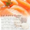 見て、この肉厚の身。しかも、ほんのり赤みがかっていることにお気づきだろうか。にんじんにも含まれる色素・カロテノイドを多く含み、北海道産ホタテの中でも約0.1%しか獲れない希少な赤玉ホタテだ。弾力のある食感、濃厚な甘みがたまらない。刺身はもちろん、フライにも最適!