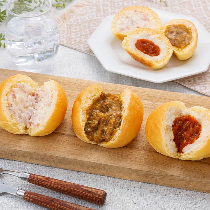 「ポケット」から取り出せるくらい手軽にサクッと「ごちそう感」。ふんわり柔らかでほんのり甘いパン生地との相性が抜群の、温めて食べるお食事パンです。 【ポケットサンド(カレー)】 複数の香辛料、フルーツ、蜂蜜などを加えたカレールーに八天堂のカスタードクリームでコクをプラス。 甘みもありながら、スパイスやフルーツなどによる深みもあるカレーフィリングはパン生地とも相性が抜群で、カレー好きにはたまらないお品です。 【ポケットサンド(チキングラタン)】 チキンの旨味が凝縮され、 北海道十勝産の牛乳を使ったコクのあるチキングラタンと、中心に入れた程よい酸味のミートソースが美味しさを引き立てます。 【ポケットサンド(ベーコンポテト)】 粒マスタードの風味が特長のポテトサラダにベーコンを混ぜ合わせてパンに注入しました。 ふんわり柔らかでほのかな甘みのあるパン生地がベーコンポテトのうま味を引き立てます。