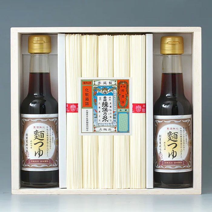 揖保乃糸上級は、「揖保乃糸」全体の80%を占め、最もご愛顧いただいている商品です。お中元などの贈答用に大変多くご利用いただいております。ぜひご賞味いただきたい逸品です。麺つゆは揖保乃糸の産地、播州龍野の本醸造醤油に鰹節、昆布、椎茸から採った上品なだしを合わせたつゆになります。