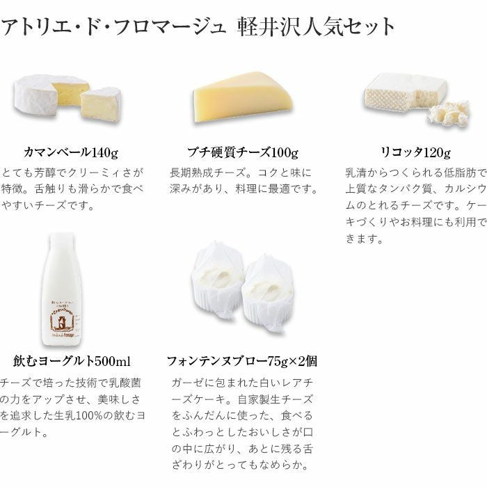 他の画像を見る 軽井沢人気セット【アトリエ・ド・フロマージュ】 チーズやヨーグルトなど5種類が入る贅沢セット 軽井沢人気セット【アトリエ・ド・フロマージュ】 販売価格 ¥ 6,300 税込 ホルスタインとジャージーの2種の生乳をブレンドした豊かなコクのチーズ。自家製生チーズを使ったレアチーズケーキ。硬質チーズは半年以上熟成させた。飲むヨーグルトは生乳100%と、贅沢なセットだ。 詳細を見る お気に入りに登録する