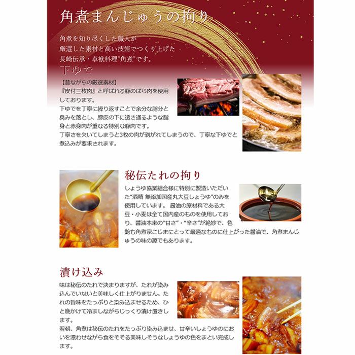 他の画像を見る 角煮ちまき(8個入) 国内産ヒヨクモチを旨味たっぷりの秘伝たれで味付け 角煮ちまき(8個入) 販売価格 ¥ 2,650 税込 粘りの強い九州産のヒヨクモチを使用し、甘辛く味付けした角煮入りの餅菓子です。長年継足しながらの秘伝のたれに旨味を加えて更に煮込み、もち米を甘辛く味付けし、角煮の赤身肉のみを混ぜ込みました。温めるともっちりとした食感の中から角煮の歯ごたえと、濃厚な甘辛さが口に広がる長崎らしい味付けの角煮ちまきです。 詳細を見る お気に入りに登録する