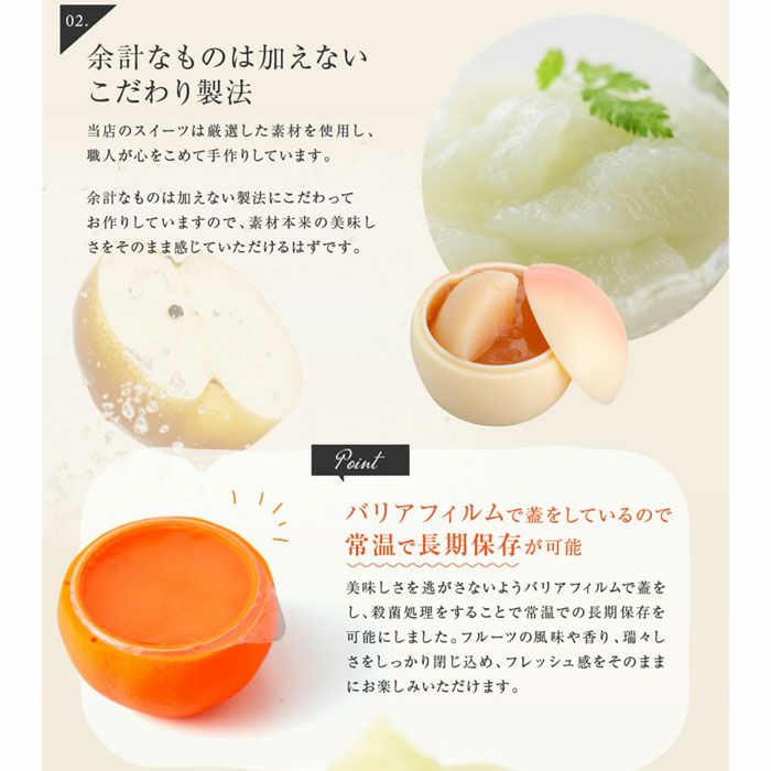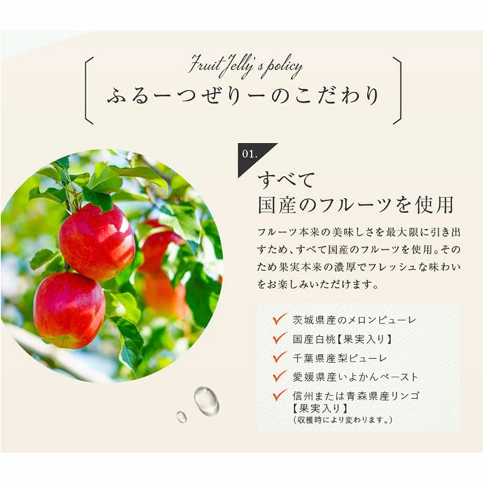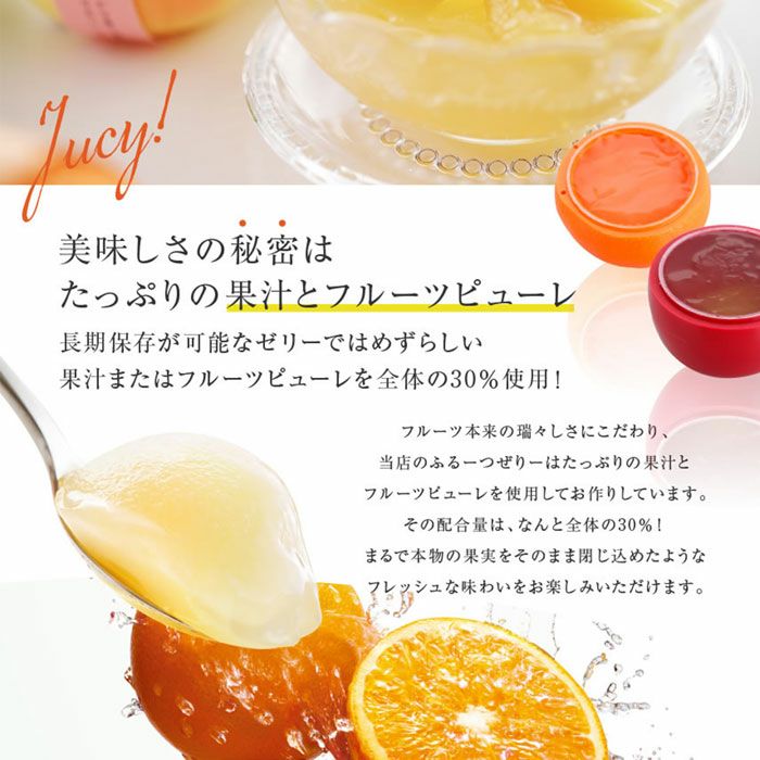 他の画像を見る ふるーつぜりー 全て国産のフルーツを使用した濃厚でフレッシュな味わいのゼリー ふるーつぜりー 販売価格 ¥ 5,100 税込 まるで本物のような果実型容器に入ったフルーツゼリーです。常温で日持ちがするのでギフトに最適。母の日・御中元・御供え・御見舞いなど様々なシーンでご利用できます。国産果実にこだわったゼリーを冷やしてお召し上がりください。 詳細を見る お気に入りに登録する