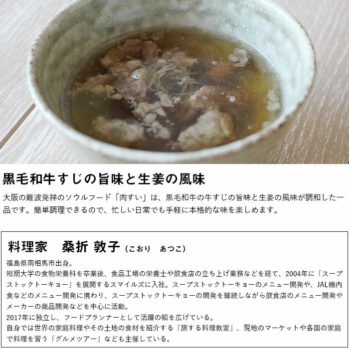 他の画像を見る <料理家 桑折敦子監修>黒毛和牛の牛すじ肉すい 浪速庶民の味を黒毛和牛×生姜でほっこり品よく <料理家 桑折敦子監修>黒毛和牛の牛すじ肉すい 販売価格 ¥ 4,180 税込 肉すいとは、肉うどんのうどん抜きのこと。浪速庶民の味なのだが、料理家・桑折敦子さん監修のコチラは、ひと味違う。贅沢にも黒毛和牛を使い、牛すじの旨みと生姜の風味が絶妙に調和して、なんとも品がいい! ダシが染みた肉も柔らかく立派。滋味豊かでしみじみと旨いのだ。 詳細を見る お気に入りに登録する