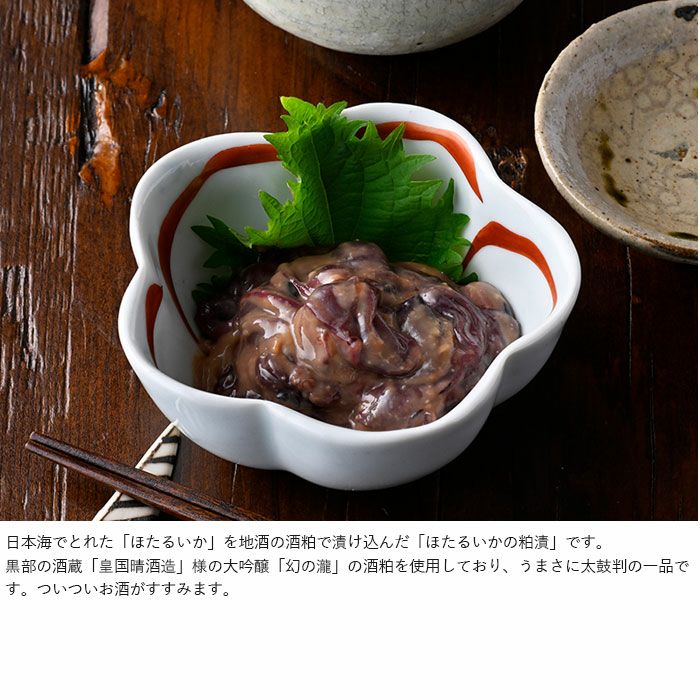 他の画像を見る ほたるいか粕漬(5パック) 地酒の酒粕が効いた濃厚で芳醇な絶品珍味 ほたるいか粕漬(5パック) 販売価格 ¥ 3,950 税込 日本海でとれた「ほたるいか」を地酒の酒粕で漬け込んだ、ほたるいかの粕漬は、旨みを膨らませた芳醇な珍味に唸ること必至。産卵のために深海から浅瀬に来た富山県のメスのホタルイカは成熟度も良く、鮮度もいい。黒部の酒蔵「皇国晴酒造」の酸味の後に米の旨味も広がる大吟醸「幻の瀧」(日本酒アワード3年連続金賞受賞)の酒粕を使用して、旨さに太鼓判の一品。ついつい日本酒がすすんでしまう。 詳細を見る お気に入りに登録する