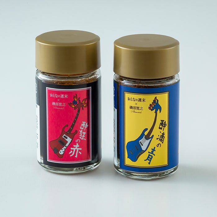 『ワタリドリ』『閃光』をはじめ、数々のヒット曲で人気を博すロックバンド[Alexandros]のベーシスト・磯部寛之。お酒を愛し、趣味のはしご酒が高じ、『おとなの週末』でも「酔滴のラダー」という連載を持つほど。また辛いもの好きでもあり、焼きとん、焼き鳥に限らず、ラーメンなどにも七味をパッパッパ。そんな磯部さんが「八幡屋礒五郎」さんとコラボし、辛さ、香り。さらにパッケージのラベルにまでにこだわり抜いたオリジナルブレンドの七味「酔狂の赤」「酔滴の青」を完成させました。赤・青各1本のセットです。ぜひ一度ご堪能あれ! ※本品は送料として別途、880円(税込)が必要です。