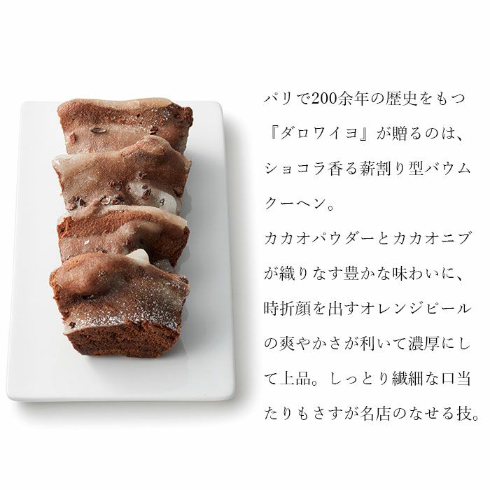 他の画像を見る 歴史あるガストロノミーの名店のショコラバウム 【ダロワイヨ】ガトー ア ラ ブロッシュ ショコラ(2箱) 販売価格 ¥ 3,850 税込 歴史あるガストロノミーの名店のショコラバウム 詳細を見る お気に入りに登録する