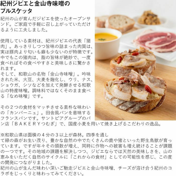 他の画像を見る 和歌山産猪肉と発酵味噌の贅沢ブルスケッタ 紀州ジビエと金山寺味噌のブルスケッタ(8個) 販売価格 ¥ 7,380 税込 和歌山産猪肉と発酵味噌の贅沢ブルスケッタ 詳細を見る お気に入りに登録する